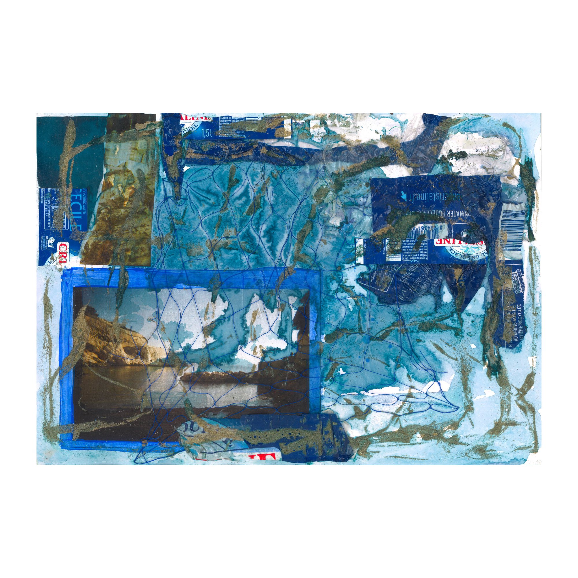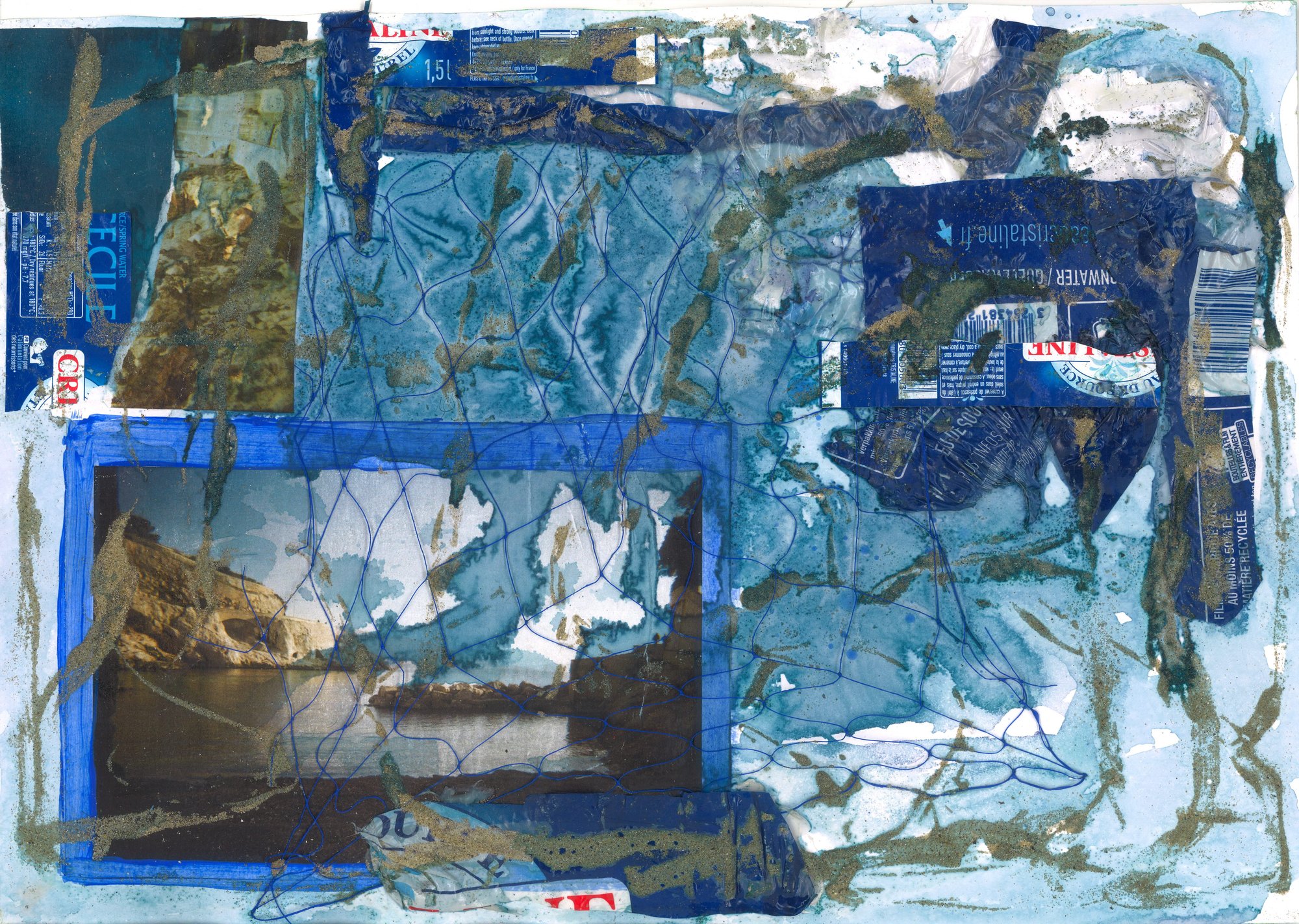 photographie, teinture de chou rouge, emballages Cristallines, filet de pêche, sable de Marseille, colle, encre et peinture acrylique sur papier/photography, red cabbage dye, Cristallines packaging, fishing net, Marseille sand, glue, blue ink and acrylic painting on paper, 29,7 x 42 cm, 2026
